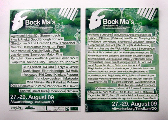 BOCK MA`S 2009 Nach der Zuerkennung des kleinen Landespreis für initiative Kulturarbeit darf sich das Freiwerk über einen weiteren Erfolg im Jahr 2009 freuen: beim Bock Ma’s Festival 2009, welches von 27. bis 29. August auf der Altwartenburg in Timelkam über die Bühne ging, konnte die Reinerlössumme des Vorjahres erneut übertroffen werden. Wie bisher kommt der Gewinn auch heuer dem Verein der Wiener Flüchtlingshelferin Ute Bock zugute. Bock Ma’s Projektverantwortlicher Reinhold Seyfriedsberger zeigt sich erfreut: „In Zeiten zunehmender Entsolidarisierung und Ausländerfeindlichkeit ist der anhaltende und wachsende Erfolg des Bock Ma´s Festival ein wichtiges Signal gegen diese Tendenzen.“